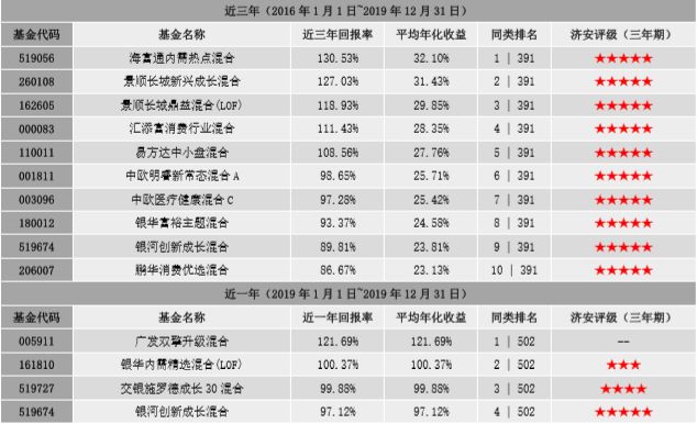 19年来主动权益类基金的赚钱效应是投资者有目共睹的,但是投资者在选择基金产品时也不应只关注短期业绩,能够在长期获得良好收益的基金产品才能满足投资者对于资产稳健增值的投资诉求。根据济安金信基金分类,以下为截至2019年12月31日各时间区间内业绩表现排名前列的主动权益类基金产品,仅供投资者参考。