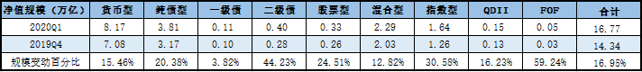 根据济安金信基金评价中心统计数据显示,截至一季度末,公募基金行业在管各类型基金产品共计6146只,资产总规模为16.77万亿,较2019年四季度末增长2.43万亿(统计不包含ETF联接基金)。各类型基金规模均在一季度有所扩张,其中,二级债型基金规模增幅最大,其次是前期受益于科技板块行情拉动而快速增长的股票型和指数型基金;为应对疫情,一季度货币政策持续宽松导致货币市场基金收益不断下滑,因此虽然货基整体规模增长,但在全市场各类型基金中总体占比依然出现下滑。